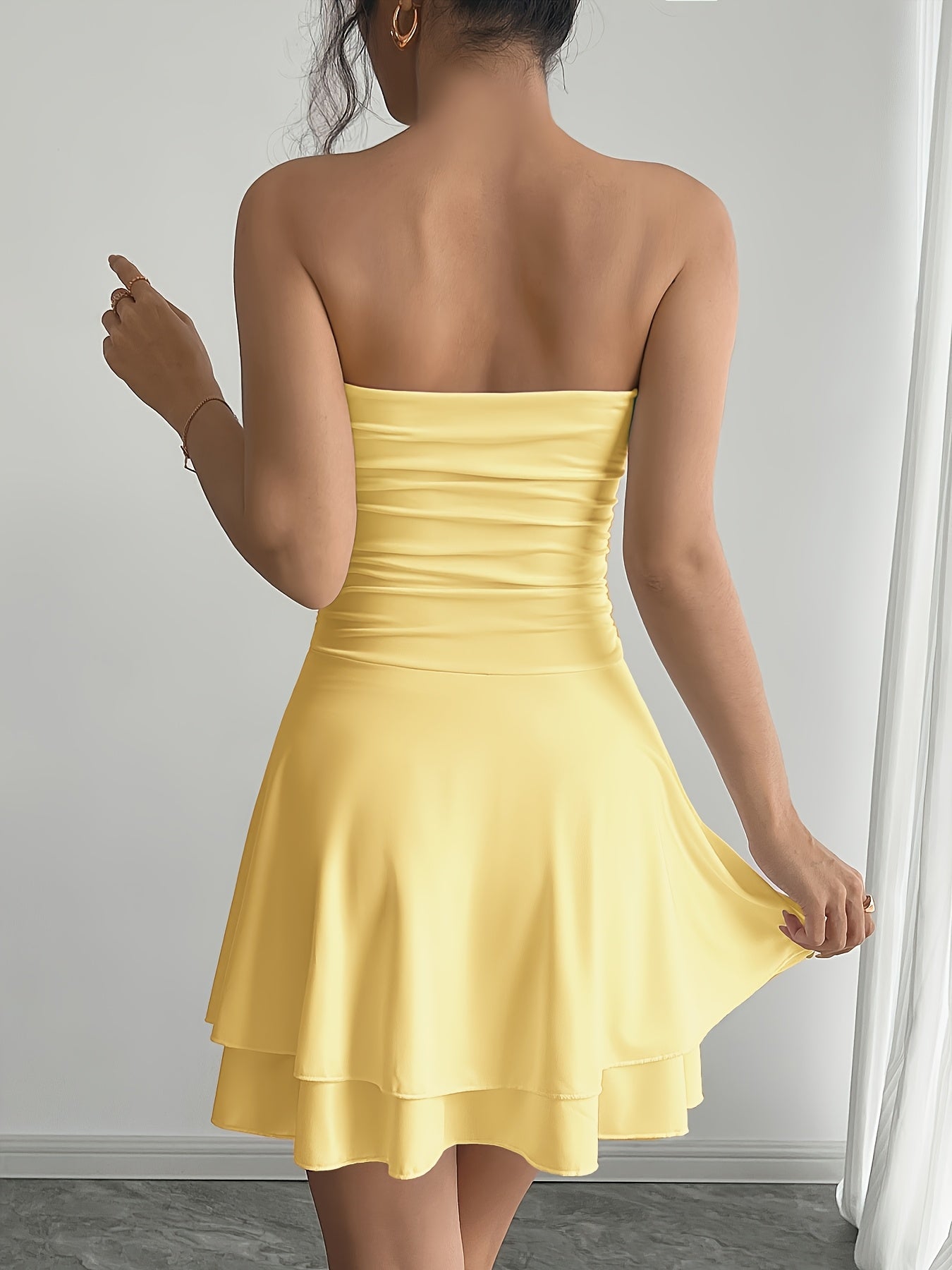 Ontdek de Stijlvolle Gele Tubusjurk met Dubbele Laag Rucheszoom, een must-have voor elke modebewuste vrouw. Deze mouwloze jurk is ontworpen met een figuurvormende snit die je silhouette prachtig accentueert.